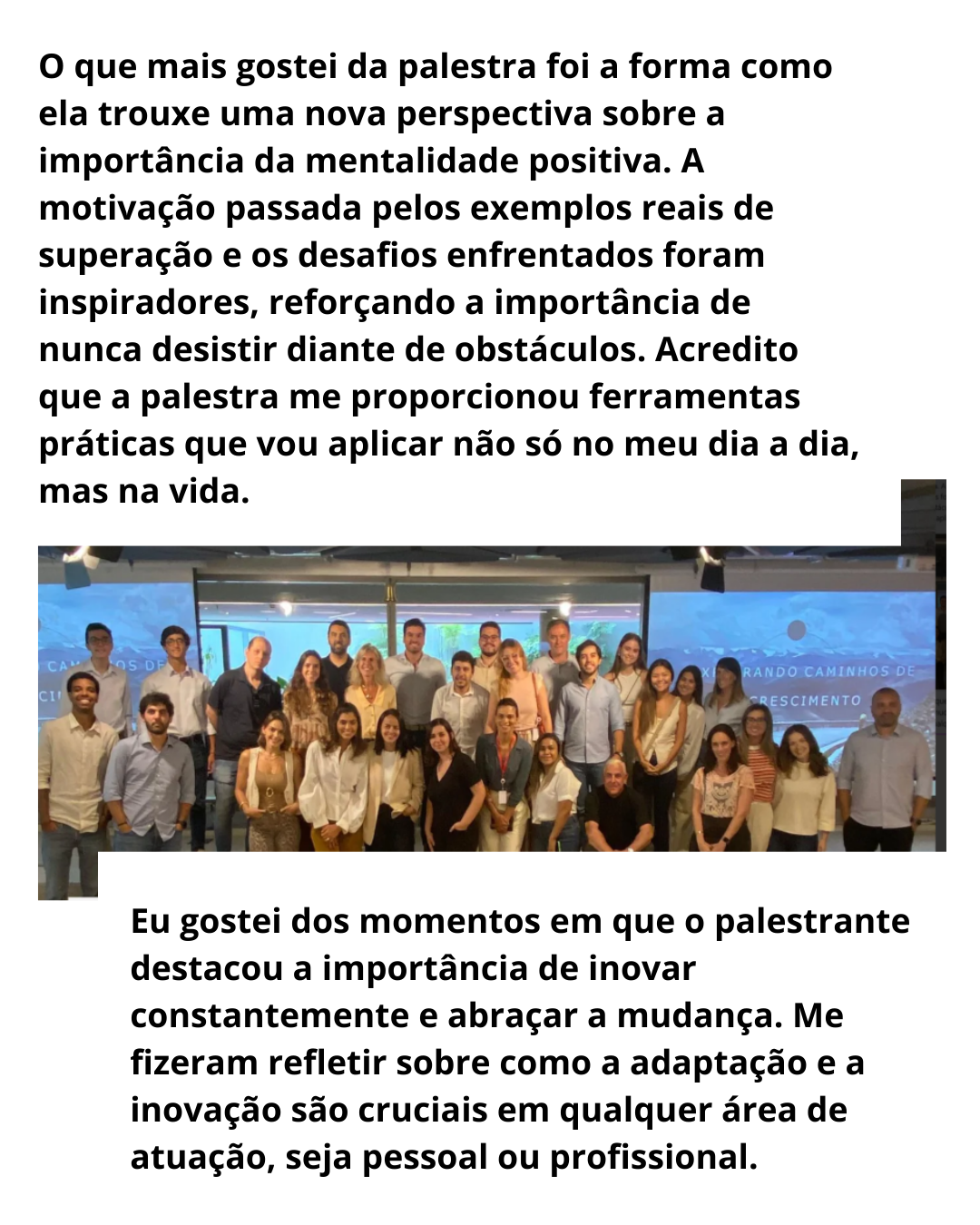 É transformação real, com impacto direto na vida e nos resultados. Confira o que líderes, equipes e participantes têm a dizer — porque quando a mensagem conecta, o efeito é duradouro.